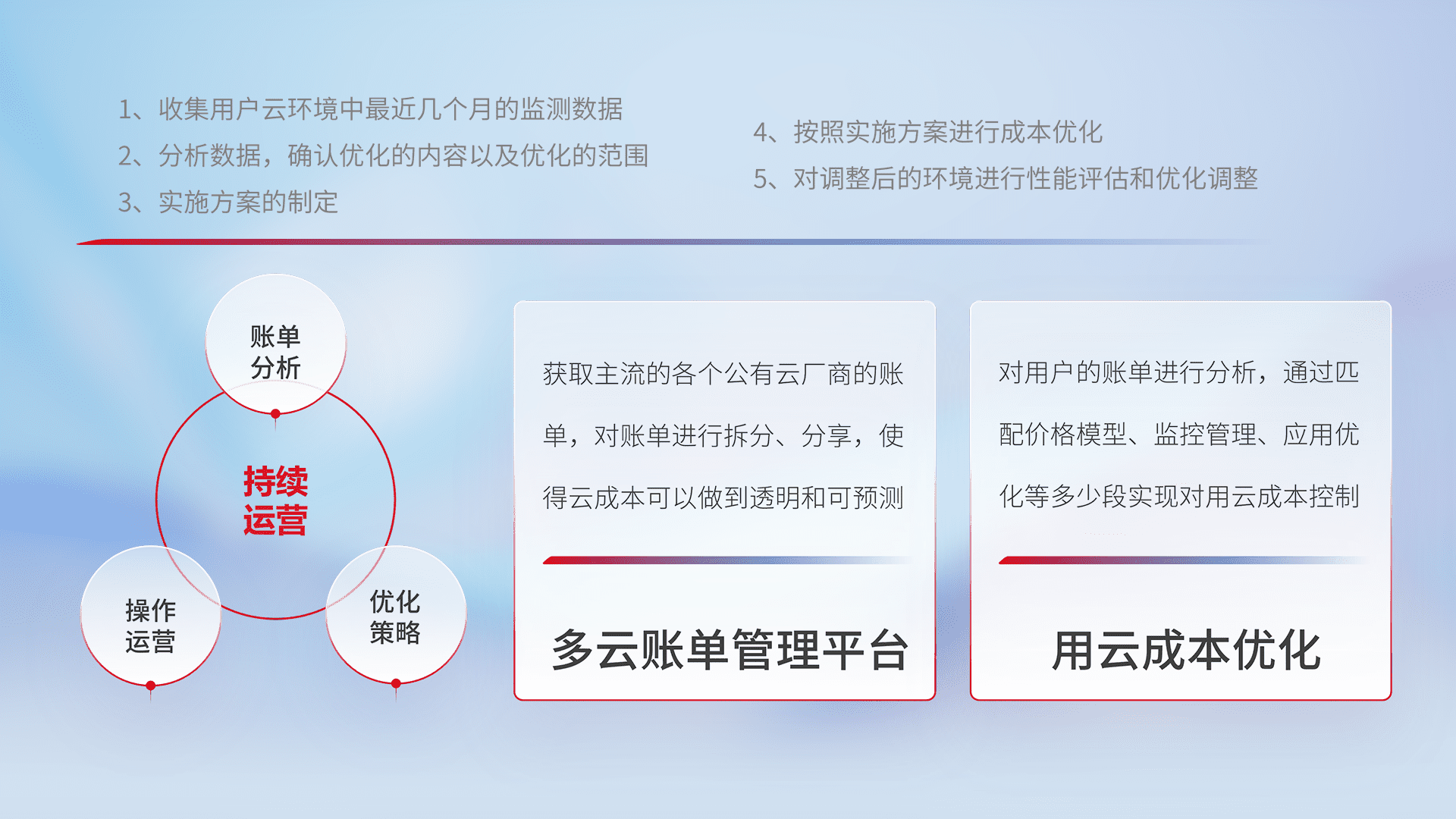 通过多云纳管,,,,以统一的资源数据模型把客户的云资源进行抽象和封装,,进而实现对多云资源的统一操作,,保障云资源管理的可靠性、、稳定性与可用性。。量身定制化运维内容,,,配置、、开发运维、、、、补丁管理、、备份、、监控、、、、认证和访问管理、、、、审计和日常巡检等,,,,保障在用云过程中的可靠度,,,,稳定度以及高可用率。。。